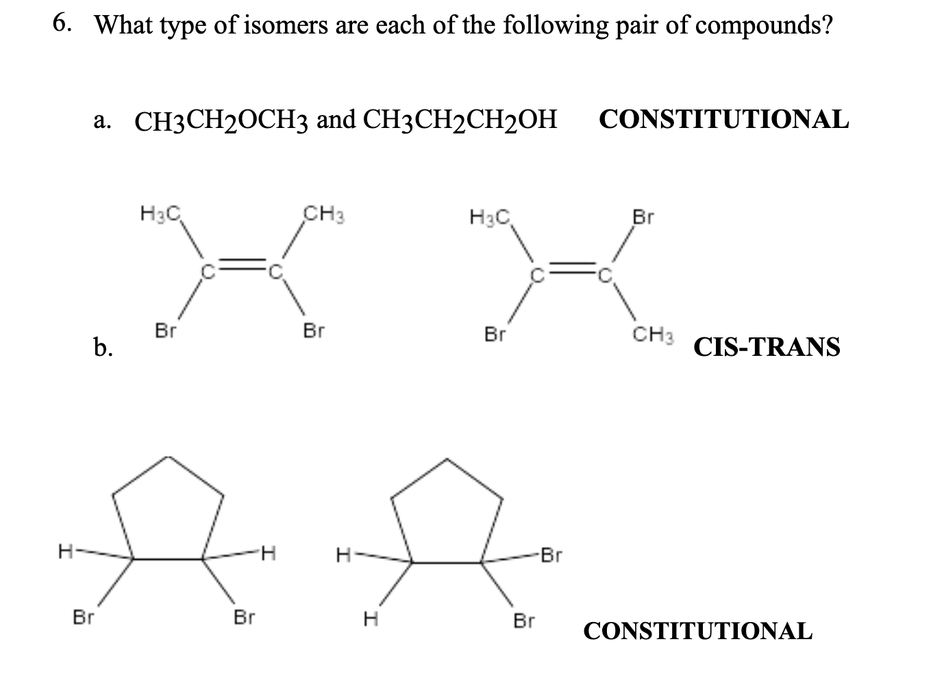 In number 4 both compounds contains three carbon atoms one oxygen and 6 hydrogen atoms that makes them isomers. CH3 H H H C-C and C C 7 l H Br CH3 Br A structural isomers B conformational isomers C positional isomers. Hope it helps u_.