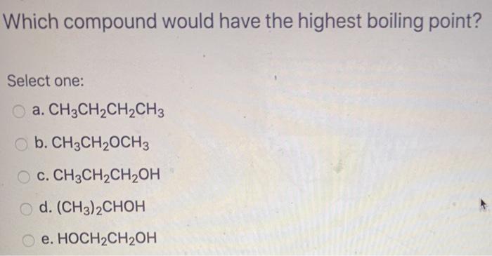 Dthe molecule might be a meso form. A constitutional B symmetrical C configurational D conformational E stereochemical. Get an answer for CH3CH2CH3 CH3CH2CH2OH CH3CH2OCH3 List them in order from highest to lowest in terms of boiling points and highest to lowest terms of their solubility in a polar solvent.