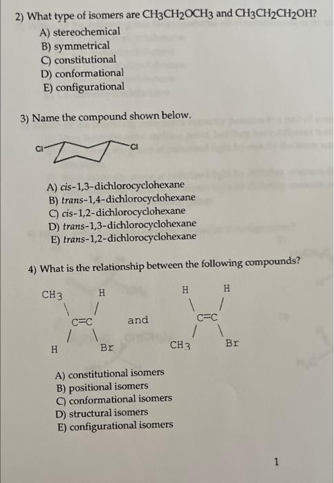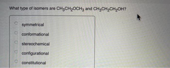 A symmetrical B constitutional C stereochemical D conformational E configurational 2 What is the relationship between the following compounds. The answer is number 4. Click hereto get an answer to your question What type of isomers are CH3CH2OCH3 and CH3CH2CH2OH.